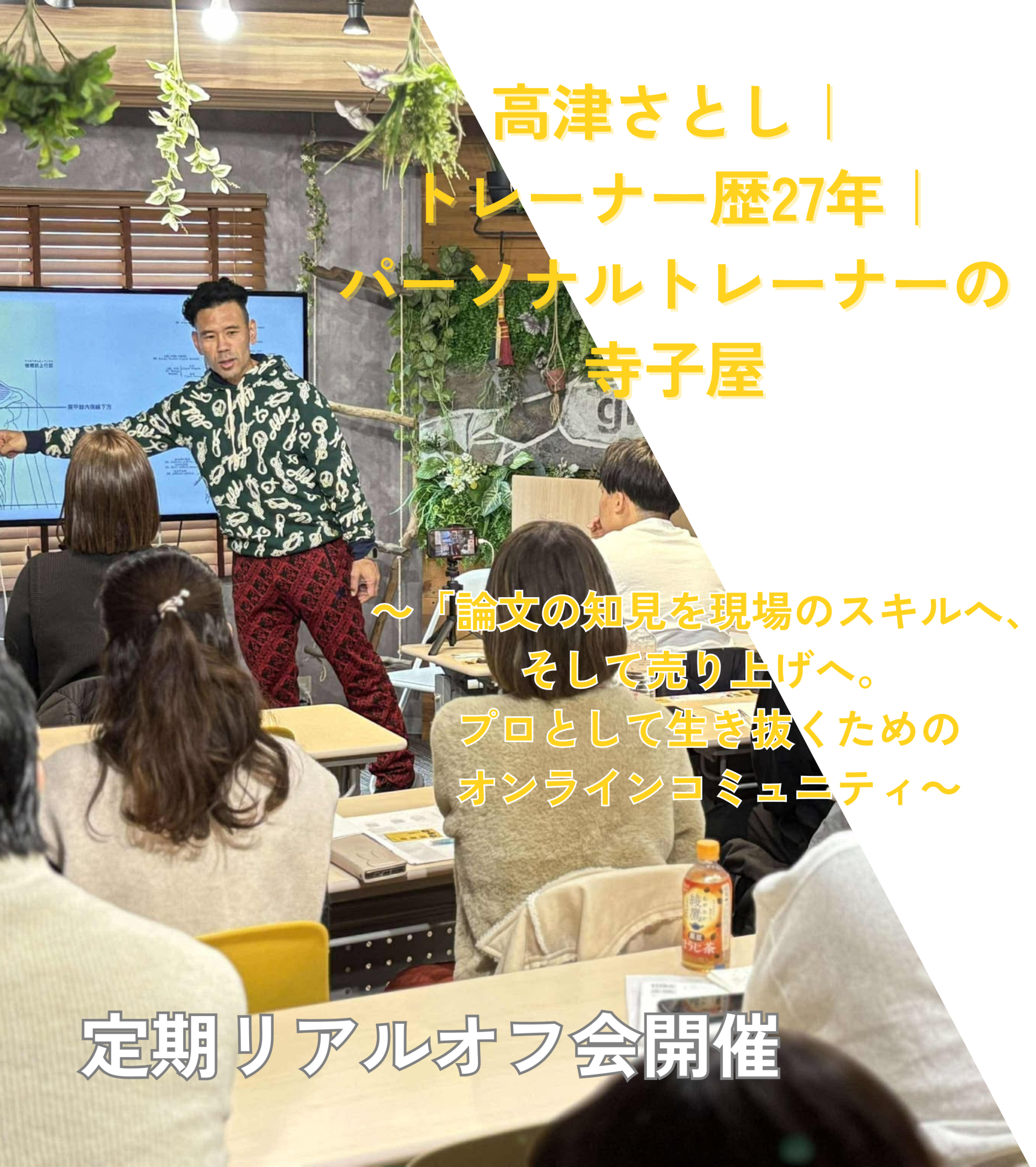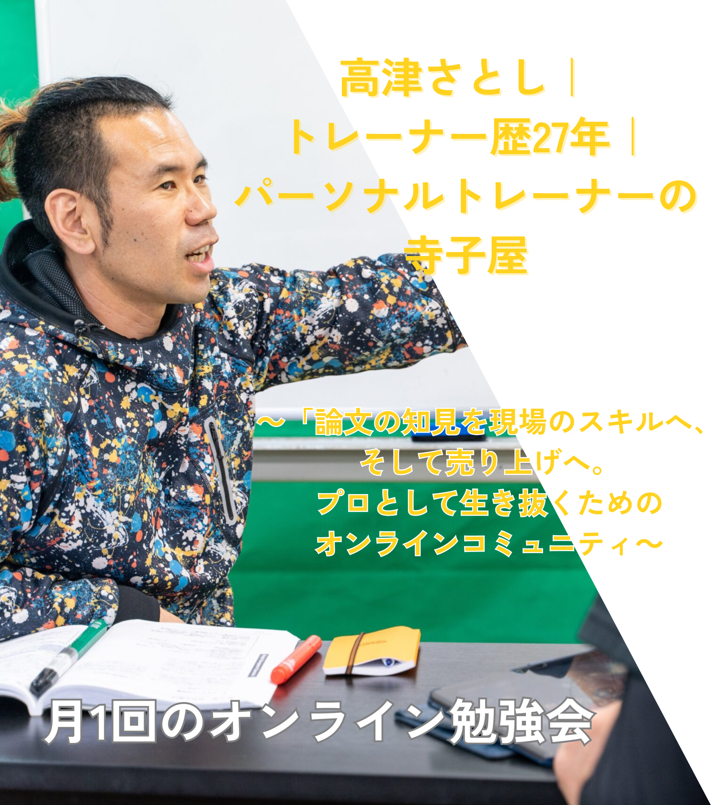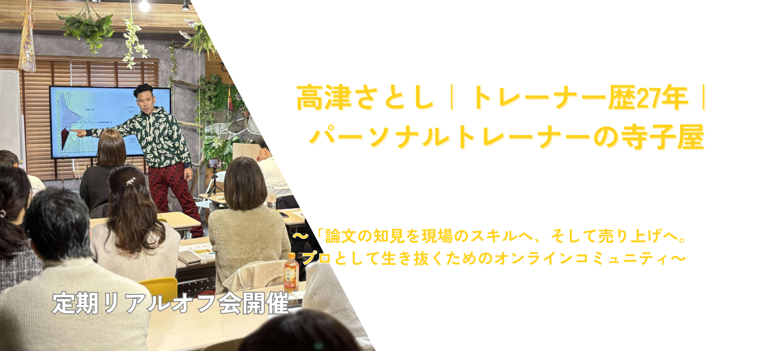 ・一生モノの仲間と環境: オンラインで全国の志高いトレーナーと繋がり、最新情報を共有し続ける実践道場。